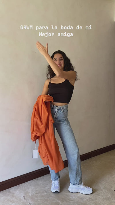 La modelo mide 1.75 cm, tiene tacones de 9 cm y usa talla S
