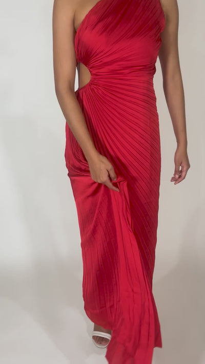 Descripción: El vestido Leia está asimétricamente drapeado y plisado con nuestra tela de satén en un tono lustroso. Esta silueta de un solo hombro presenta un corte cut-out redondo en el lateral y un dobladillo alto y bajo. Disponible en otros colores.