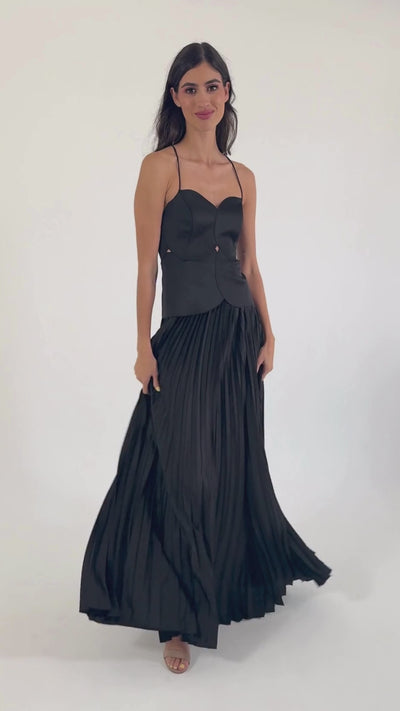 Notas: Mirra te hará robar miradas... un diseño maxi de estilo corset que moldea la figura con un toque único y femenino, acompañado de tirantes finos que se cruzan en la esplada, realzando los hombres dando un toque sofisticado, además su falda es plisada y fluida. Disponible en color negro, azul, rosa y verde.
