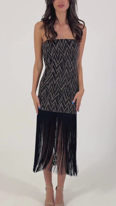 Descripción: ¡Aporta un toque de glamour a tu look! El elegante Vestido Paula en tela metalizada con estampado Zig Zag de flecos, te hará sentir especial. Con su cierre oculto en la espalda y sin tirantes, es ideal para eventos formales. ¡Impresiona!